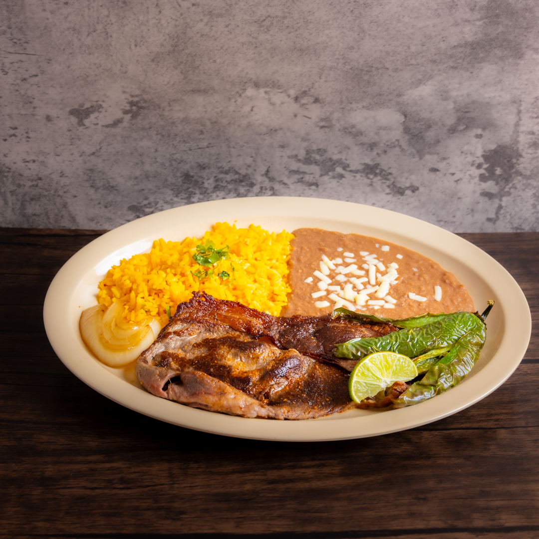 Grilled Mexican still steak served with onions, peppers, tortillas & 2 sides.