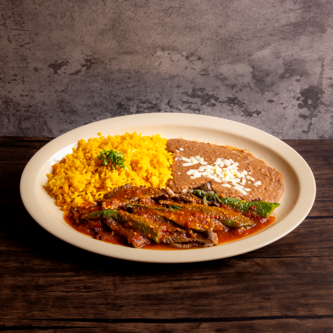 Grilled steak with onions and peppers cooked in red sauce, served with tortillas and 2 sides.