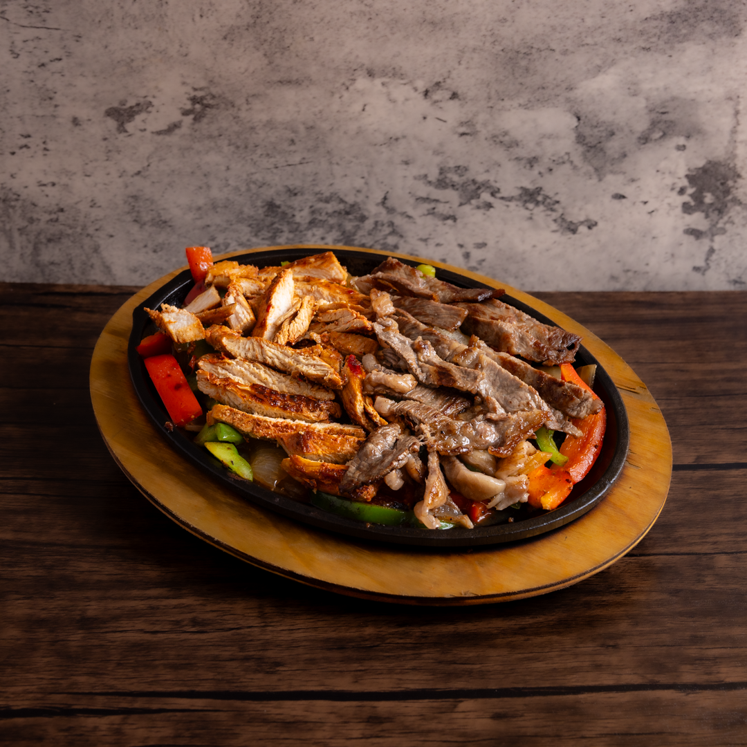 Grilled onions & peppers mixed with your choice of protein, served with rice, beans, salad & tortillas.